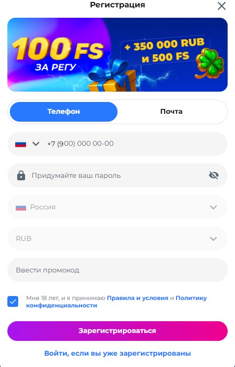 100 FS за регистрацию. Бездепозитный бонус: 100 фриспинов начисляются автоматически после подтверждения контактных данных — номера телефона или email. Промокод вводить не нужно. Вейджер выигрышей с фриспинов — x30. Для активации дополнительный депозит не требуется.