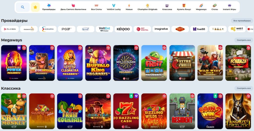 Игровой каталог Champion casino насчитывает 3 000+ тайтлов от более 110 провайдеров. Новые игры добавляются регулярно. Почти все слоты доступны в демо-режиме без регистрации — удобно для изучения механики перед первой реальной ставкой. Каталог фильтруется по провайдеру, жанру, волатильности и популярности.